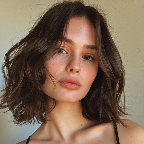 Boyun hizasında, net hatlı ama hafif içe kıvrılmış bu model, klasik bob’un daha sıcak, daha Akdenizli versiyonu. 2025 yazının en çok talep gören şehirli kadın kesimi.
