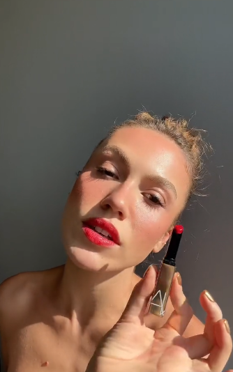 Dudaklarda da tıpkı yanaklar gibi kırmızı bir ton elde etmek gerekiyor. Her ne kadar Bieber bunun için yanağına kullandığı allıktan tekrar destek alsa da, trendi deneyen influencer Duygu Özaslan'ın TikTok'ta paylaştığı videoda da gördüğümüz üzere Strawberry makeup'ın yıldızı kesinlikle NARS Afterglow Sensual Shine Lipstick serisinden Voltage rengi!