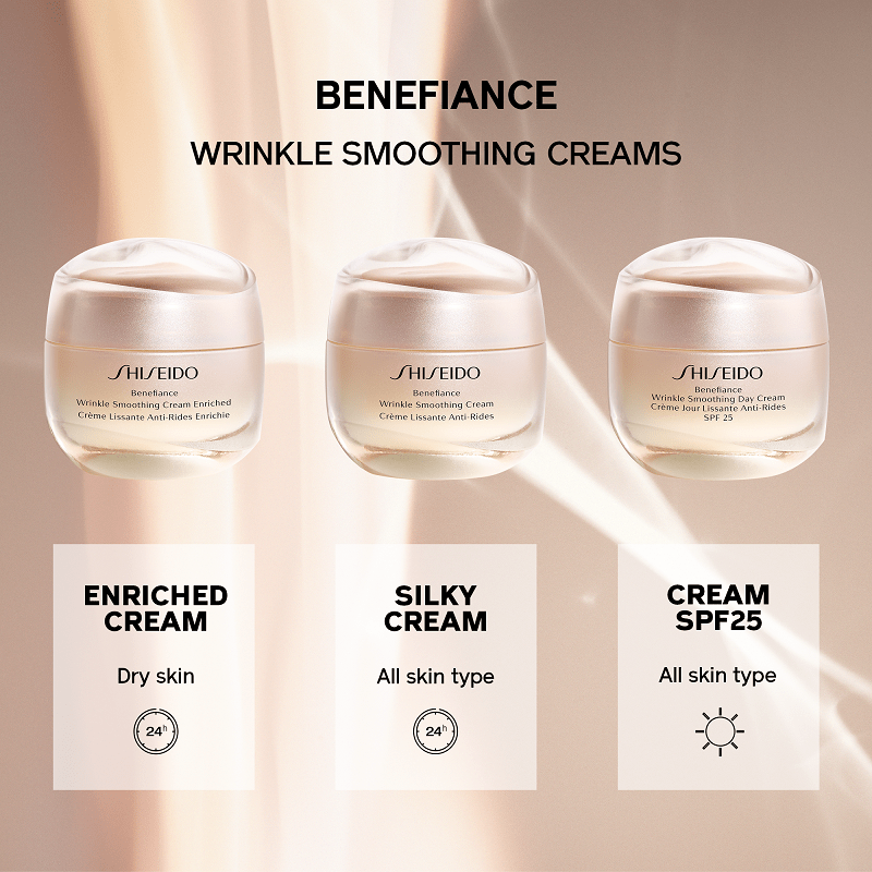 (1)Shiseido Benefiance serisi ürünlerinin ciltteki odak noktası ince çizgiler ve kırışıklıklardır. Düzenli kullanımda ciltteki ince çizgi ve kırışıklık görünümünü minimize eder. Ve gelecekte oluşacak hasarı en aza indirir. Aynı zamanda cilde yoğun nem verir ve cildinizin daha sağlıklı, aydınlık ve canlı görünmesini sağlar.