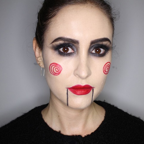 Saw filminin baş karakteri Jigsaw, beyazperdenin de en gerilim yaratan karakterlerinden biri. Cadılar Bayramı ruhunu da oldukça uyum sağladığı ortada. Onun görünümü için en çok öne çıkan detay kırmızı bir kalem ile yanaklarınıza spiral çizmek. Bunun için Shiseido Lipliner Inkduo - True Red ya da NARS Precision Lip Liner - Holy Red kullanabilirsiniz.