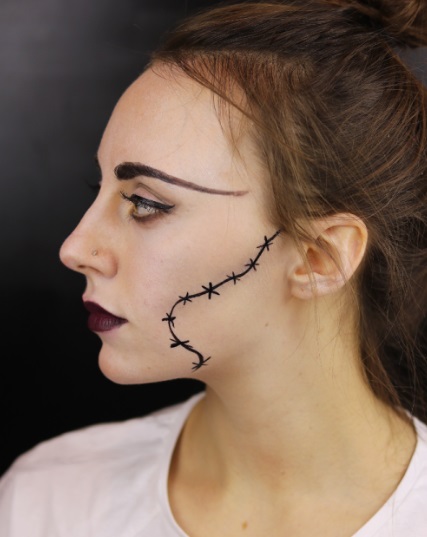 Siyah eyeliner kullanarak yapabileceğiniz kolay cadılar bayramı makyajı arasında bu görünüm de yer alıyor. Cadılar Bayramı konseptine uyum sağlayacak dikiş detayını NARS Climax Eyeliner ile yanağınıza ya da yüzünüzün istediğiniz herhangi bir kısmına yapabilirsiniz.