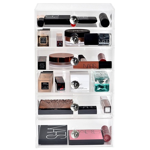 Eğer makyaj malzemelerinizi çekmece içinde değil de masanın üzerinde tutuyorsanız, düzen için bu organizerden destek alabilirsiniz. 6 katlı kutunun özel kristalden taşlı kulpları vardır. Makyaj malzemelerinizin düzenli kalması ve hijyenik durması açısından oldukça iyi bir alternatiftir.