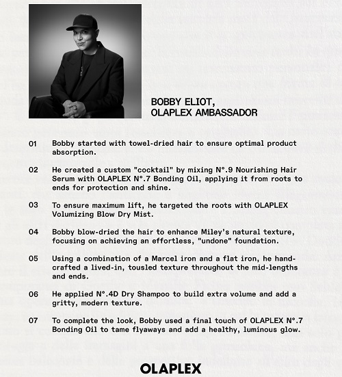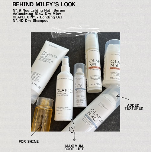 Miley Cyrus’ın saç stilisti Bobby Eliot, Golden Globe hazırlık sürecinde Olaplex ürünlerini tercih ederek saçın bağ yapısını güçlendirmeye odaklandı. Bobby Eliot Miley Cyrus’ın saçlarını hazırlarken No.9 Bond Protector Hair Serum, No.7 Bonding Oil, Volumizing Blow Dry Mist ve No.4D Dry Shampoo’dan destek aldı..