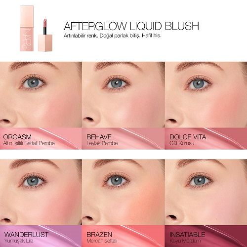 NARS’ın ikonik ve neredeyse tüm dünyanın tanıdığı meşhur ORGASM rengi Afterglow Liquid Blush serisinin de yıldızı konumunda. Bununla birlikte seride yer alan diğer renkler ise şöyle;