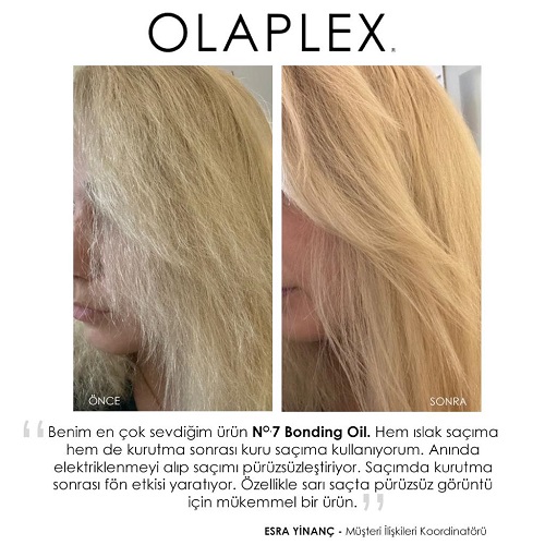Benim en çok sevdiğim ürünlerden biri de No:7 Bonding Oil… Hem ıslak saçıma hem de kurutma sonrası kuru saçıma kullanıyorum. Anında elektriklenmeyi alıp saçımı pürüzsüzleştiriyor. Normalde dalgalı bir saçım vardır. Özellikle sarı saçta pürüzsüz görüntü için mükemmel bir ürün.”