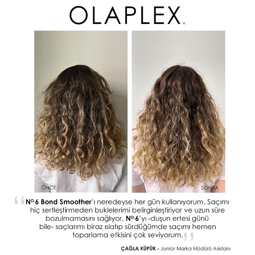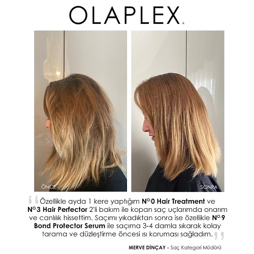 “Yaklaşık 2 aydır Olaplex ürünlerini kullanıyorum. Düzenli olarak 1,5-2 ayda bir saçlarıma işlem uygulanıyor. Açma-boyama işlemi öncesinde haftada 2 kere No:3 Hair Perfector ve No:0 Intensive Bond Building Hair Treatment ürünlerini kullanıyorum. Saçlarımda kopma, yanma, sertleşme olmuyor. Diğer zamanlarda ise bu işlemi haftada 1 kere yapıyorum. Bu iki ürün gerçekten saç tellerini güçlendiriyor ve kopmalara kırılmalara karşı koruyor.