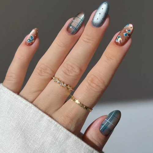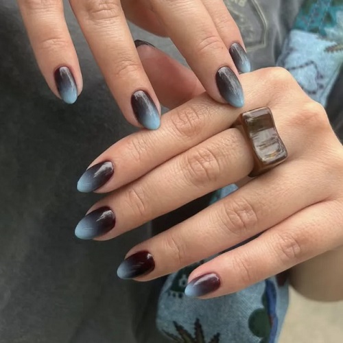 5. Ombre stili: Tırnak diplerinden uçlara doğru maviye dönen kahverengi tonlar, ışıltılı ve zarif bir görünüm sağlar.