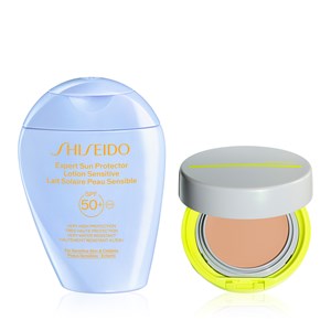 Bu setin içerisinde %85 oranında cilt bakım içerikleriyle formüle edilen hassas ciltlere ve çocuklara uygun Shiseido Expert Sun Protector Lotion Sensitive SPF50+ ve cildi güneşe karşı koruyan, nemli ve parlak bitişli kompakt BB krem Shiseido Sports BB Compact SPF50+ yer alır.