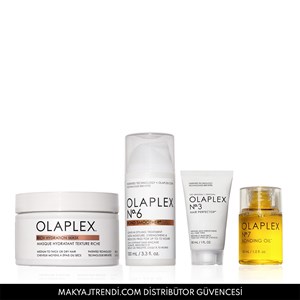 Olaplex Anti-Frizz & Maximize Moisture Set içerisinde Olaplex Rich Hydration Mask Mask, Olaplex No.6 Bond Smoother, No. 3 Hair Perfector 30ML ve No. 7 Bonding Oil 7,5ML yer alır. Rich Hydration Mask kuru, orta ve kalın telli saçlar için yoğun nemlendirici özelliğe sahip ve elektriklenmeyi kontrol altına alan maskedir. Saça 16 kat daha fazla nem kazandırır. Biyomimetik Kütikül Teknolojisi ile formüle edilen bu saç maskesi, saç kütiküllerine 5 yıkamada nemi hapseder ve saç hasarına karşı kalkan oluşturur. No.6 Bond Smoother saçı ağırlaştırmadan pürüzsüz hale getiren ve durulanmayan saç şekillendiricidir. 72 saate kadar elektriklenmeyi azaltır. Kuru, boyalı ve kimyasal işlem görmüş tüm saçlar için yüksek konsantre formülüyle saçları nemlendirir ve güçlendirir. No.3 Hair Perfector, saçtaki kırılmaları azaltarak saçı gözle görünür şekilde güçlendirir. No.7 Bonding Oil Ultra besleyici, şekillendirici ve onarıcı bakım yağıdır. Saçınızda yağlı bir görünüm bırakmadan saçları onarır ve yeniler. Elektriklenmeyi en aza indirirken 232 dereceye kadar UV/ısı koruması sağlar. Ürün detayları aşağıdadır.