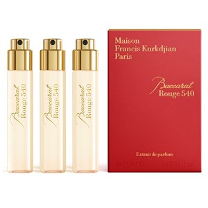 Maison Francis Kurkdjian Baccarat Rouge 540 Extrait de Parfum, 3 adet 11 ml parfüm ve değerli sprey kutusunun altın rengi versiyonundan oluşur. Baccarat Rouge 540 Extrait de Parfum, Mısır’ın muhteşem çiceksi grandiflorum yasemini, safran, sedir ağacı, acıbadem, amber ve misk gibi iddialı notalara sahip. Parfüm aynı zamanda Maison Francis Kurkdjian’ın sanatını ve zamanla kazanılan bilgeliğini temsil ediyor.