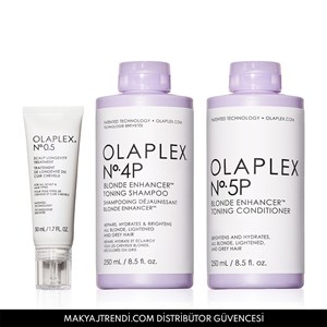 Olaplex Blonde Hair & Scalp Strengthening Set içerisinde No.0.5 Scalp Longevity Treatment, No. 4P Blonde Enhancer Toning Shampoo ve No.5P Blonde Enhancer Toning Conditioner yer alır. No.0.5 Scalp Longevity Treatment saç sağlığını korumak için formüle edilmiş dengeleyici, güçlendirici, yaşlanma karşıtı etkili saç derisi serumudur. Sadece saç derisine uygulanır. Pürüzsüz, parlak, sağlıklı saçlar sağlıklı bir saç derisiyle başladığı için bu saç derisi serumu, saç derisini anında nemlendirir, yatıştırır ve aynı zamanda saç derisinin hızla yaşlanmasına karşı koruyarak saç sağlığını destekler. No. 4P Blonde Enhancer Toning Shampoo yoğun işlem görmüş tüm saç tipleri için, özellikle sarı, açık ve gri saçlar için uygundur. No.5P Blonde Enhancer Toning Conditioner saçların daha kolay taranmasını sağlayan ve saçı derinlemesine nemlendiren mor saç kremidir. Mor şampuan ve mor saç kremi yoğun işlem görmüş saçlarda istenmeyen turuncu ve sarı yansımaları gözle görülür şekilde engeller. Ürün detayları aşağıdadır;