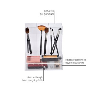 İki gözlü pleksi makyaj organizeri, üstü kapaklı ve altı çekmeceli (kapaklı) fırça kutusudur. Çok kullanışlı, çok yönlü bir organizerdir. Bu kutu sayesinde fırçalarınızın hepsini belli bir düzen içinde görebilir, aradığınız fırçayı daha hızlı bulabilirsiniz. Fırçalarınızın hijyeni açısından oldukça iyi bir alternatif olan bu kapaklı şeffaf makyaj kutusu, görünümüyle de oldukça şıktır. Pleksi boyutları (23x17) genişliğinde 20 cm yüksekliğindedir.
