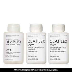 Olaplex Fine Bond Maintenance System Travel Trio set içerisinde Olaplex No. 4 Fine Bond Maintenance Shampoo (100ml),Olaplex No. 5 Fine Bond Maintenance Conditioner (100ml) ve Olaplex No.3 Hair Perfector (100ml) bulunur. No.4 Fine Bond Maintenance Shampoo ince telli saçlar için özel olarak geliştirilmiş, ağırlık yapmadan saçları temizleyen ve hacim veren bağ güçlendirici bakım şampuanıdır. İnce telli saçlara hacim verdiği ve güçlendirdiği klinik olarak kanıtlanmıştır. Saçları nazikçe temizlerken aynı zamanda güçlendirir ve korur. No. 5 Fine Bond Maintenance Conditioner ince telli saçlar için özel olarak geliştirilmiş, ağırlık yapmayan, ultra hafif yapıda bağ güçlendirici saç kremidir. İnce telli saçlara hacim verdiği ve güçlendirdiği klinik olarak kanıtlanmıştır. %60 oranında saç kırıklarının azalmasını sağlar. No. 3 Hair Perfector boya, ısı, güneş ve çevresel faktörlerden dolayı yıpranmış, hasar görmüş tüm saçlar için bakım ürünüdür. Olaplex’in en çok satan ürünü olmayı başaran N°3 Hair Perfector, saçtaki kırılmaları azaltarak saçı gözle görünür şekilde güçlendirir. Ürün detayları aşağıdadır.