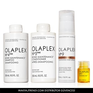Olaplex Fine Protector Set içerisinde Olaplex No. 4 Fine Bond Maintenance Shampoo (250ml), Olaplex No. 5 Fine Bond Maintenance Conditioner (250ml), Olaplex No. 9 Bond Protector Nourishing Hair Serum ve Olaplex No.7 Bonding Oil (7,5ml) bulunur. No.4 Fine Bond Maintenance Shampoo ince telli saçlar için özel olarak geliştirilmiş, ağırlık yapmadan saçları temizleyen ve hacim veren bağ güçlendirici bakım şampuanıdır. İnce telli saçlara hacim verdiği ve güçlendirdiği klinik olarak kanıtlanmıştır. Saçları nazikçe temizlerken aynı zamanda güçlendirir ve korur. No. 5 Fine Bond Maintenance Conditioner ince telli saçlar için özel olarak geliştirilmiş, ağırlık yapmayan, ultra hafif yapıda bağ güçlendirici saç kremidir. İnce telli saçlara hacim verdiği ve güçlendirdiği klinik olarak kanıtlanmıştır. %60 oranında saç kırıklarının azalmasını sağlar. No. 9 Bond Protector Nourishing Hair Serum ısıya karşı koruma sağlayan ve besleyici saç serumudur. 232 dereceye kadar ısı koruması sağlamasının yanı sıra çevresel faktörlerin verdiği zarardan da korur. No.7 Bonding Oil ultra besleyici, şekillendirici ve onarıcı bakım yağıdır. Saçınızda yağlı bir görünüm bırakmadan saçları onarır ve yeniler. Saçınızdaki hasarlı disülfit bağlarını güçlendirmek için formüle edilmiş yıldız bileşen bis-aminopropil diglikol dimaleat içerir. Elektriklenmeyi en aza indirirken 232 dereceye kadar UV/ısı koruması sağlar. Ürün detayları aşağıdadır.