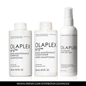 Olaplex Fine Volume Boost set içerisinde Olaplex No. 4 Fine Bond Maintenance Shampoo (250ml), Olaplex No. 5 Fine Bond Maintenance Conditioner (250ml) ve Olaplex Volumizing Blow Dry Mist bulunur. No.4 Fine Bond Maintenance Shampoo ince telli saçlar için özel olarak geliştirilmiş, ağırlık yapmadan saçları temizleyen ve hacim veren bağ güçlendirici bakım şampuanıdır. İnce telli saçlara hacim verdiği ve güçlendirdiği klinik olarak kanıtlanmıştır. Saçları nazikçe temizlerken aynı zamanda güçlendirir ve korur. No. 5 Fine Bond Maintenance Conditioner ince telli saçlar için özel olarak geliştirilmiş, ağırlık yapmayan, ultra hafif yapıda bağ güçlendirici saç kremidir. İnce telli saçlara hacim verdiği ve güçlendirdiği klinik olarak kanıtlanmıştır. %60 oranında saç kırıklarının azalmasını sağlar. Volumizing Blow Dry Mist saçlara hacim ve doku kazandıran, saçın kuruma süresini hızlandıran, ısı hasarına karşı korumaya yardımcı olan spreydir. Bu çok amaçlı ürün tüm saç tipleri için uygundur. Ürün detayları aşağıdadır.