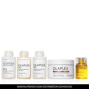 Olaplex Hair Repair & Hydration Kit içerisinde Olaplex Rich Hydration MaskMask, No. 4 Bond Maintenance Shampoo, No. 5 Bond Maintenance Conditioner, No. 3 Hair Perfector ve No.7 Bonding Oil yer alır. Rich Hydration Mask kuru, orta ve kalın telli saçlar için yoğun nemlendirici özelliğe sahip ve elektriklenmeyi kontrol altına alan maskedir. Saça 16 kat daha fazla nem kazandırır. Biyomimetik Kütikül Teknolojisi ile formüle edilen bu saç maskesi, saç kütiküllerine 5 yıkamada nemi hapseder ve saç hasarına karşı kalkan oluşturur. No. 4 Bond Maintenance Shampoo yüksek oranda nemlendirici ve onarıcı şampuandır. Saçtaki kırılmaları azaltır ve elektriklenmeyi önlemeye yardımcı olur. No. 5 Bond Maintenance Conditioner saçların daha kolay taranmasını sağlarken, saçı derinlemesine nemlendirir. No. 3 Hair Perfector ise boya ya da ısı sonucu yıpranmış saçları güçlendirerek saçtaki kırılmaları azaltır ve saçı gözle görünür şekilde daha sağlıklı hale getirir. No. 7 Bonding Oil saçlarda yağlı bir his bırakmaz ve 232 dereceye kadar UV/ısı koruması sağlar. Sağlıklı görünümü ve dokuyu geri kazandırır. Ürün detayları aşağıdadır.