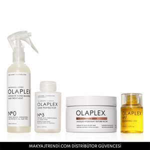 Olaplex No More Dryness Kit içerisinde Olaplex Rich Hydration Mask, No. 0 Intensive Bond Building Hair Treatment, No. 3 Hair Perfector ve No. 7 Bonding Oil yer alır. Rich Hydration Mask kuru, orta ve kalın telli saçlar için yoğun nemlendirici özelliğe sahip ve elektriklenmeyi kontrol altına alan maskedir. Saça 16 kat daha fazla nem kazandırır. Biyomimetik Kütikül Teknolojisi ile formüle edilen bu saç maskesi, saç kütiküllerine 5 yıkamada nemi hapseder ve saç hasarına karşı kalkan oluşturur. No. 0 Intensive Bond Building Hair Treatment kuru ve hasarlı saçları tekrar hayata döndürmenin ilk adımını sunar ve saç bağlarını yeniden güçlendirmek için saç bakım tedavisinin etkinliğini arttırır. No.3 Hair Perfector, saçtaki kırılmaları azaltarak saçı gözle görünür şekilde güçlendirir. No.7 Bonding Oil Ultra besleyici, şekillendirici ve onarıcı bakım yağıdır. Saçınızda yağlı bir görünüm bırakmadan saçları onarır ve yeniler. Elektriklenmeyi en aza indirirken 232 dereceye kadar UV/ısı koruması sağlar. Ürün detayları aşağıdadır.