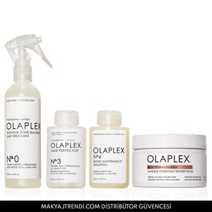Olaplex Prep, Cleanse & Nourish Hair Kit içerisinde Olaplex Rich Hydration Mask Mask, No. 0 Intensive Bond Building Hair Treatment, No. 3 Hair Perfector ve No. 4 Bond Maintenance Shampoo yer alır. Rich Hydration Mask kuru, orta ve kalın telli saçlar için yoğun nemlendirici özelliğe sahip ve elektriklenmeyi kontrol altına alan maskedir. Saça 16 kat daha fazla nem kazandırır. Biyomimetik Kütikül Teknolojisi ile formüle edilen bu saç maskesi, saç kütiküllerine 5 yıkamada nemi hapseder ve saç hasarına karşı kalkan oluşturur. No.4 Bond Maintenance Shampoo her kullanımda saçları daha parlak ve sağlıklı hale getiren, yüksek oranda nemlendirici, onarıcı şampuandır. Saçtaki boyama, ısıyla şekillendirme ve günlük yıpranma sonucunda tehlikeye giren hasarlı disülfür bağlarını güçlendiren Olaplex’in patentli bağ güçlendirme teknolojisine sahiptir. No. 0 Intensive Bond Building Hair Treatment kuru ve hasarlı saçları tekrar hayata döndürmenin ilk adımını sunar ve saç bağlarını yeniden güçlendirmek için saç bakım tedavisinin etkinliğini arttırır. No.3 Hair Perfector, saçtaki kırılmaları azaltarak saçı gözle görünür şekilde güçlendirir. Ürün detayları aşağıdadır.