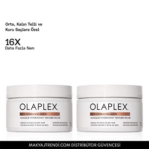 Olaplex Rich Hydration Mask Duo içerisinde iki adet Olaplex Rich Hydration Mask bulunur. Rich Hydration Mask kuru, orta ve kalın telli saçlar için yoğun nemlendirici özelliğe sahip ve elektriklenmeyi kontrol altına alan maskedir. Saça 16 kat daha fazla nem kazandırır. Biyomimetik Kütikül Teknolojisi ile formüle edilen bu saç maskesi, saç kütiküllerine 5 yıkamada nemi hapseder ve saç hasarına karşı kalkan oluşturur. Kırılmaları azaltır ve korurken, parlaklık ve tüm gün süren elektriklenme kontrolü sağlar. Açıcı işlem görmüş saçlarda bile çok etkilidir. Saç kırılmalarında %71 azalma sağlar. Avokado ve Shea Bakım Kompleksi, saç tellerini nemle sararak ipeksi yumuşaklık ve ışıltılı bir parlaklık kazandırır.