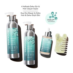 We Are Paradoxx Growth Shampoo 250ml, Growth Conditioner 250ml, Growth Advanced Scalp Serum ve Jade Comb Gua Sha içeren settir. We Are Paradoxx Growth Thickening Shampoo, hacimli, dolgun bir görünüm sağlamak için formüle edilmiştir. Saç tellerinin güçlenmesine yardımcı olmak için biyotin, kafein ve ginseng karışımı içerir. We Are Paradoxx Growth Thickening Conditioner seyrek ve zayıflamış saçları besler. Besleyici formül saç tellerini güçlendirmeye yardımcı olur, saçların daha dolgun görünmesini sağlar ve sağlıklı saç büyümesini destekler. We Are Paradoxx Growth Advanced Scalp Serum kafein, vegan keratin, biotin ve atkuyruğu özü gibi uyarıcı özlerle güçlendirilmiştir. 4 haftada daha kalın, daha dolgun ve daha sağlıklı saçlar yaratır. Jade Comb Gua Sha ise doğal yeşim taşından yapılmış masaj taşıdır. Tarak şekilli Gua Sha, hem masaj aleti hem de tarak olarak kullanılır. Saç köklerini besler, saç derisindeki kan dolaşımını arttırarak, saçlara parlaklık ve sağlıklı bir görünüm kazandırır. Ürün detayları aşağıdadır.