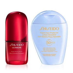 Shiseido Sun Defense & Renew Set içerisinde Shiseido Expert Sun Protector Lotion Sensitive SPF50+ ve Shiseido Ultimune Power Infusing Serum yer alır. Shiseido Expert Sun Protector Lotion Sensitive SPF50+ hassas ciltler ve çocuklar için özel olarak geliştirilmiş, nazik içeriklere sahip hafif yapılı ve nemlendirici özellikli SPF50+ güneş losyonudur. %85 oranında cilt bakım içerikleriyle formüle edilmiştir. Cildi UV kaynaklı hasara, nem kaybına ve kuruluğa karşı korur. Wetforce teknolojisi ile su ve ter ile temasta koruma daha da güçlenir. Ultimune Power Infusing Serum, cildin iç savunmasını etkinleştirirken aynı zamanda stres ve çevresel faktörlere karşı koruma sağlayan serumdur. Cildin yaşlanma sürecini yavaşlatır ve aynı zamanda yaşlanma karşıtı etki sunar. Cildin ideal durumuna ulaşması için cildin kan akışını uyarır. Cildi nemlendirir, stres ve doğal yaşlanma etkilerine karşı korur. Ürün detayları aşağıdadır.