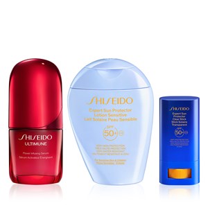 Shiseido Sun Defense & Repair Set içerisinde Shiseido Expert Sun Protector Lotion Sensitive SPF50+, Shiseido Expert Sun Protector Clear Stick SPF50+ ve Shiseido Ultimune Power Infusing Serum yer alır. Shiseido Expert Sun Protector Lotion Sensitive SPF50+ hassas ciltler ve çocuklar için özel olarak geliştirilmiş, nazik içeriklere sahip hafif yapılı ve nemlendirici özellikli SPF50+ güneş losyonudur. %85 oranında cilt bakım içerikleriyle formüle edilmiştir. Cildi UV kaynaklı hasara, nem kaybına ve kuruluğa karşı korur. Wetforce teknolojisi ile su ve ter ile temasta koruma daha da güçlenir. Shiseido Expert Sun Protector Clear Stick SPF50+ hem günlük hayatta hem de seyahat halindeyken UV savunması için SPF 50+ içeren şeffaf güneş koruyucudur. SychroShield Teknolojisi ile güçlendirilen bu stik güneş kremi, su ve ısıyla daha da güçlenen bir formüle sahiptir. Argan yağı ile ince çizgiler ve eşit olmayan cilt tonunu gözle görülür şekilde iyileştirir ve daha pürüzsüz bir cilt ortaya çıkarır. %65 cilt bakım içeriklerine sahiptir. Shiseido Ultimune Power Infusing Serum, cildin iç savunmasını etkinleştirirken aynı zamanda stres ve çevresel faktörlere karşı koruma sağlayan serumdur. Cildin yaşlanma sürecini yavaşlatır ve aynı zamanda yaşlanma karşıtı etki sunar. Cildin ideal durumuna ulaşması için cildin kan akışını uyarır. Cildi nemlendirir, stres ve doğal yaşlanma etkilerine karşı korur. Ürün detayları aşağıdadır.