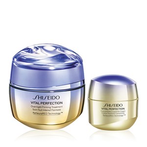 Shiseido Supreme Night Glow Set içerisinde Vital Perfection Concentrated Supreme Cream 30 ml ve Vital Perfection Overnight Firming Treatment 50 ml bulunur. Vital Perfection Concentrated Supreme Cream sıkılaşmış, toparlanmış ve yeniden kontürü belirginleşmiş görünüm için cildin ihtiyaçlarını hedefleyen yaşlanmaya karşıtı bakım kremidir. Cildin içten sarkmasını önler. Koyu lekeleri, donukluğu, sarkmayı, derin kırışıklıkları ve ince çizgileri iyileştirir. Vital Perfection Overnight Firming Treatment, cildi sıkılaştırma ve toparlama uzmanı Vital Perfection serisinin tüm ciltler için uygun gece kremidir. Cildin gün boyunca aldığı hasarları gece boyunca onarır. Ürün detayları aşağıdadır.