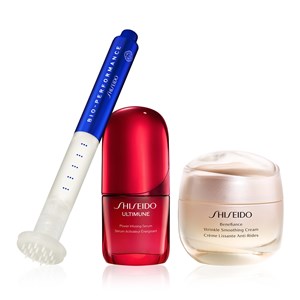 Shiseido Triple Action Anti-Age System Set içerisinde Shiseido Bio-Performance Micro-Click Concentrate, Shiseido Benefiance Wrinkle Smoothing Cream 50ml ve Shiseido Ultimune Power Infusing Serum 30ml yer alır. Bio-Performance Micro-Click Concentrate estetik prosedürlerden ilham alarak geliştirilen sarkma, kırışıklık ve gözenek gibi yaşa bağlı sorunları hedef alan özel bir konsantredir. Bu yeni nesil serum, PreciseDelivery Teknolojisi ile 18 mikro uçlu aplikatör aracılığıyla Niacinamidin doğru cilt derinliğine hassas ve kontrollü şekilde iletilmesini sağlar. Cildi sıkılaştırmaya ve nemlendirmeye yardımcı olurken ince çizgileri ve donukluğu gözle görülür şekilde azaltır. Benefiance Wrinkle Smoothing Cream anti-aging ve kırışıklık karşıtı etkili nemlendiricidir. Bu krem, sadece 2 haftada gözle görülür bir şekilde kırışıklıkları azaltır, ince çizgileri düzeltir ve cilde nem verir. Ultimune Power Infusing Serum, cildin iç savunmasını etkinleştirirken aynı zamanda stres ve çevresel faktörlere karşı koruma sağlayan serumdur. Cildin yaşlanma sürecini yavaşlatır ve aynı zamanda yaşlanma karşıtı etki sunar. Cildin ideal durumuna ulaşması için cildin kan akışını uyarır. Cildi nemlendirir, stres ve doğal yaşlanma etkilerine karşı korur. Donukluk, pürüzlülük, sıkılık kaybı, ince çizgiler, kırışıklıklar, düzensiz cilt tonu ve elastikiyet kaybıyla savaşır. Ürün detayları aşağıdadır.