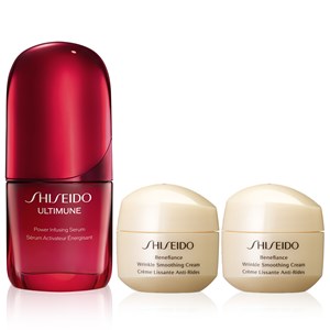 Shiseido Ultimune & Wrinkle Defense Trial Set içerisinde Ultimune Power Infusing Serum 30 ml ve iki adet Benefiance Wrinkle Smoothing Cream 15 ml yer alır. Ultimune Power Infusing Serum, cildin iç savunmasını etkinleştirirken aynı zamanda stres ve çevresel faktörlere karşı koruma sağlayan serumdur. Cildin yaşlanma sürecini yavaşlatır ve aynı zamanda yaşlanma karşıtı etki sunar. Benefiance Wrinkle Smoothing Cream, cildin yenilenme sürecini hızlandırır. Gözle görülür problemleri onarır. Gelecekte oluşabilecek cilt hasarlarına karşı direnç sağlar. Sadece 2 haftada gözle görülür bir şekilde kırışıklıkları azaltır, ince çizgileri düzeltir ve cilde nem verir. Ürün detayları aşağıdadır.