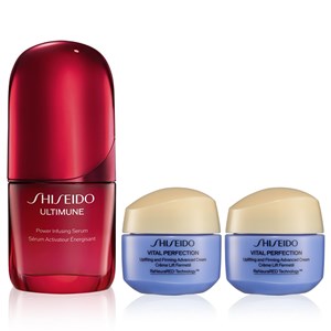 Shiseido Ultimune & Uplifting and Firming Trial Set içerisinde Ultimune Power Infusing Serum 30 ml ve iki adet Vital Perfection Uplifting And Firming Cream 15 ml yer alır. Ultimune Power Infusing Serum, cildin iç savunmasını etkinleştirirken aynı zamanda stres ve çevresel faktörlere karşı koruma sağlayan serumdur. Cildin yaşlanma sürecini yavaşlatır ve aynı zamanda yaşlanma karşıtı etki sunar. Shiseido Vital Perfection Uplifting and Firming Cream, cildi sıkılaştırma ve toparlama uzmanı Vital Perfection serisinin normal ciltler için uygun nemlendirici kremidir. Sadece 1 haftada daha sıkı bir cilt görünümü yaratır. 4 hafta içinde daha toparlanmış ve aydınlık bir cilt ortaya çıkarır. Ürün detayları aşağıdadır.