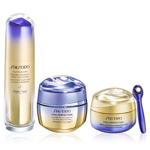 Shiseido Vital Perfection Overnight Skincare Routine içerisinde Shiseido Vital Perfection Uplifting & Firming Advanced Eye Cream, Shiseido Vital Perfection LiftDefine Radiance Night Concentrate ve Shiseido Vital Perfection Overnight Firming Treatment 50ml yer alır. Vital Perfection Uplifting & Firming Advanced Eye Cream yaşlanma belirtilerini hedef alan ve gelişmiş formüle sahip derinlemesine nemlendirici göz çevresi kremidir. En büyük özellikleri arasında göz çevresini sıkılaştırması, toparlaması ve aydınlatması yer alır. Retinol ACE ile güçlendirilen bu gelişmiş formül, göz kapağı sarkmalarını, koyu halkaları ve derin kırışıklıkları sadece 1 haftada iyileştirir. Vital Perfection Overnight Firming Treatment, cildi sıkılaştırma ve toparlama uzmanı Vital Perfection serisinin tüm ciltler için uygun gece kremidir. Cildin gün boyunca aldığı hasarları gece boyunca onarır.Civanperçemi Özü & Aqua-in-pool gece hasar onarım geninin çalışmasını teşvik eder. Sarkma, elastikiyet kaybı ve leke gibi yaşlanma belirtileriyle savaşmak isteyen kadınlar için idealdir. Vital Perfection LiftDefine Radiance Night Concentrate, sıkılaşmış, toparlanmış ve yeniden kontürü belirginleşmiş bir görünüm için uyurken yer çekimi etkilerine meydan okuyan gece konsantresidir. Cilt sarkmasıyla yoğun bir şekilde mücadele eder. Ürün detayları aşağıdadır.
