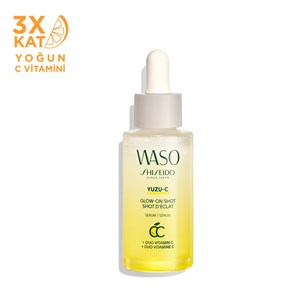 Shiseido Waso Yuzu-C Glow-On Shot, cilde anında parlaklık ve nem artışı sağlayan, Yuzu bileşeni ve C Vitamini içeren, vegan sertifikalı iki fazlı serumdur. Anında doğal parlaklık ve gün boyunca derin nemlendirme sağlar. Tek kullanımda bile cildinizin yorgunluğuna ve donukluğuna veda edersiniz. Japon Yuzu özünün nem yükleme gücünü ve aydınlatıcı özelliğini içeriğindeki C Vitamini ile birleştirir. İlk kullanımda %36 daha parlak bir cilt elde edersiniz. Cildiniz 24 saate kadar nemini korur. İçeriğindeki C vitamini erken yaşlanma belirtilerine karşı etkilidir. Bitkisel yağlardan oluşan formülü, cildin daha yumuşak, esnek ve parlak görünmesini sağlar. %98 doğal kökenli birleşenlere sahiptir. Sürdürülebilir cam şişede sunulmaktadır. Tüm cilt tipleri için uygundur. 28 ML.